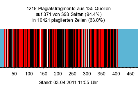 - Plagiatsfunde listet alle bisher gefundenen Plagiate auf. Diese Fundstellen werden, wie hier dokumentiert, in kleinstmögliche Einheiten - Fragmente - zerlegt, und jeweils einer Plagiatskategorie sowie den Originalquellen zugeordnet und überprüft.